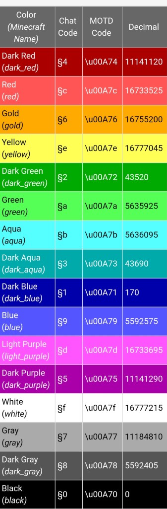 In Minecraft, there are a number of built-in color codes and format codes that you can use in chat and game commands.