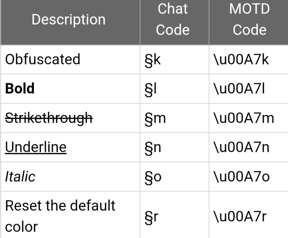 Here is a list of format codes that are available in Minecraft: